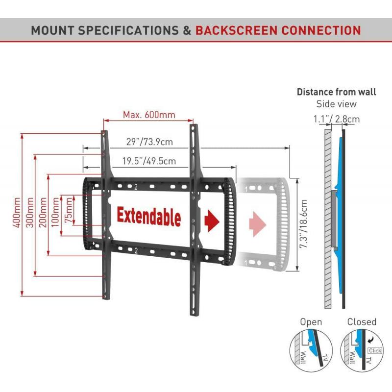 Suport TV de perete Barkan, pentru ecrane de pana la 13" - 90", greutate maxima suportata 60kg, distanta fata de perete 80mm - 200mm, VESA max. 600x400 mm, negru