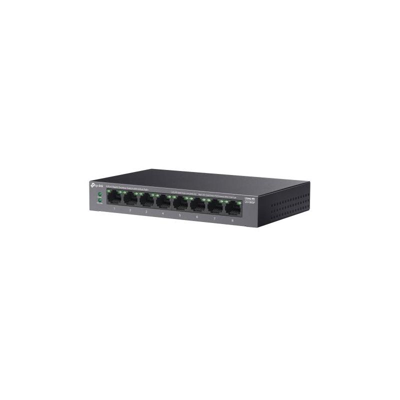 TP-LINK 5-PORT GIGABIT SWITCH LS108GP, interfata 8× 10/100/1000Mbps RJ45 Ports (Ports 1–8 supports 802.3af/at PoE+), AUTO Negotiation, AUTO MDI/MDIX, porturi Standard: 802.3 af/at compliant, PoE Ports: Ports 1–8, pana la 30 W PoE output per port, PoE Bu